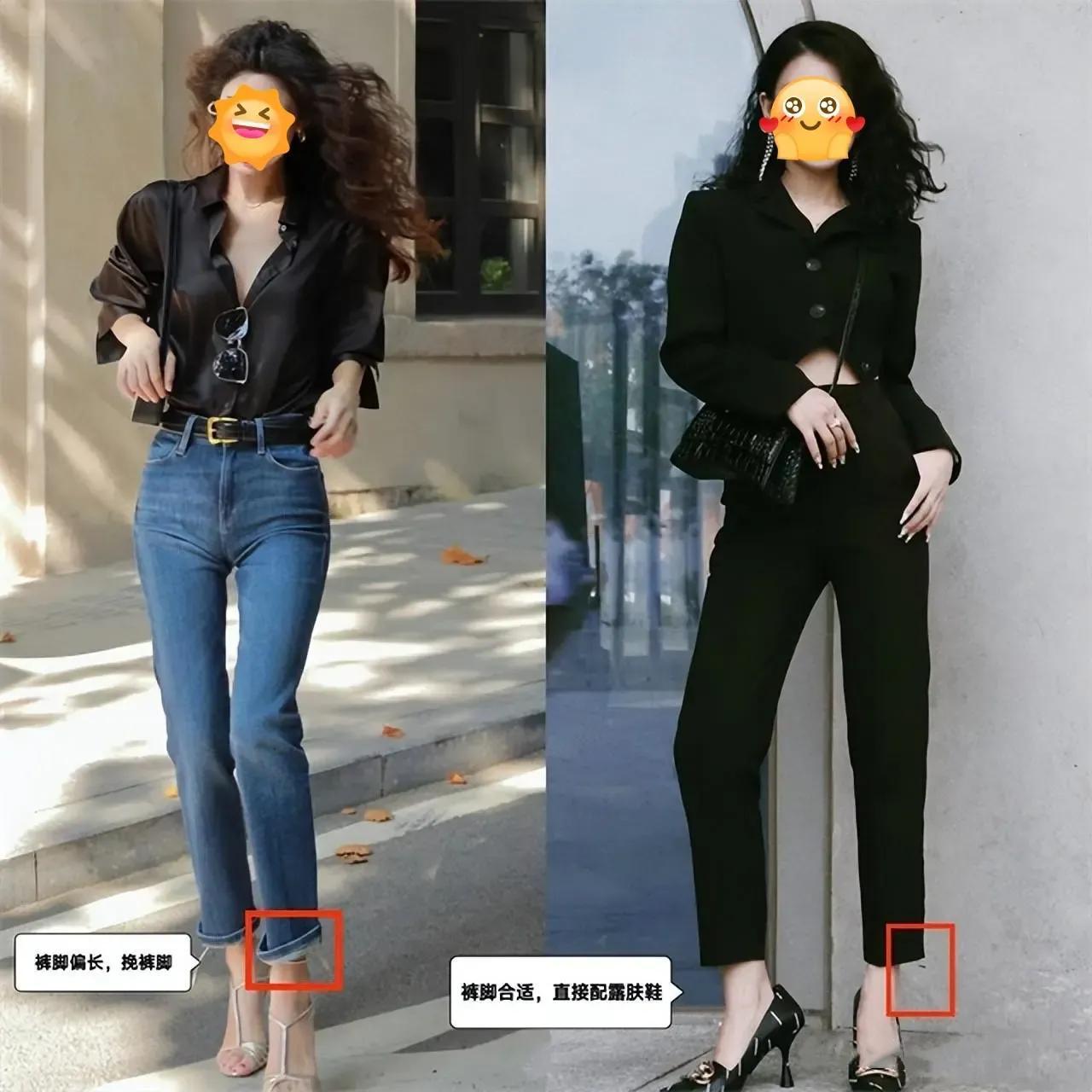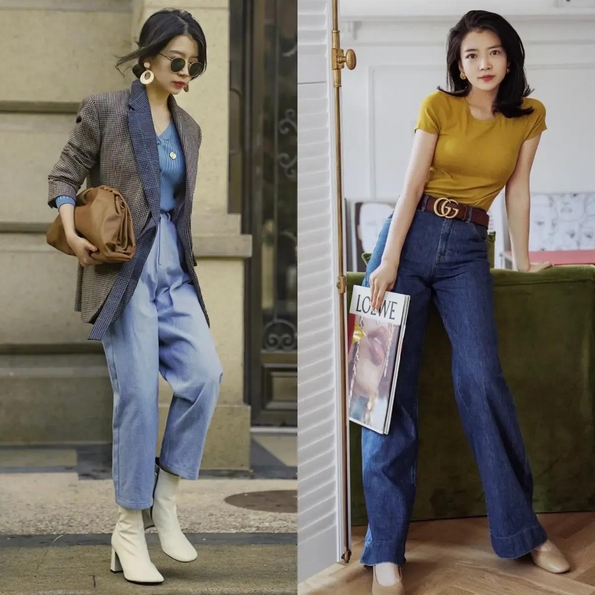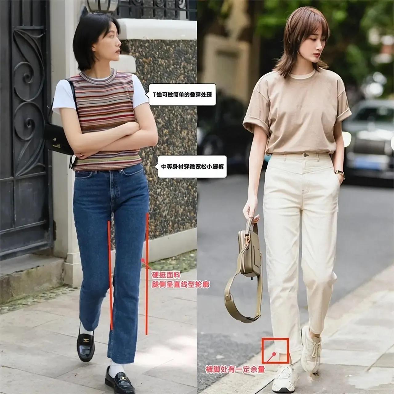接着咱们再来看下面这两套穿衣打扮选择的也是九分裤,不过我们在选择裤子的时候,面料一定要硬挺,裤子的腿侧呈直线形轮廓,怎样才能更好的修饰腿型,中等身材穿微宽松小脚牛仔裤最为合适。