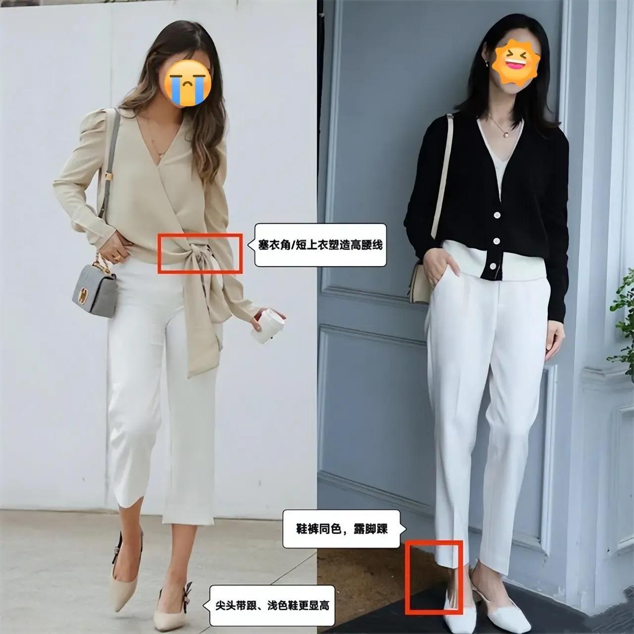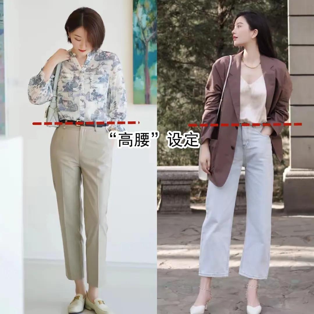 我们在选择西装裤的时候,同样要选择高腰收腰款,而且穿的时候可以把上衣的衣角塞进裤子里面,或者在衣角打个蝴蝶结,这种方式能很好的提升腰线。