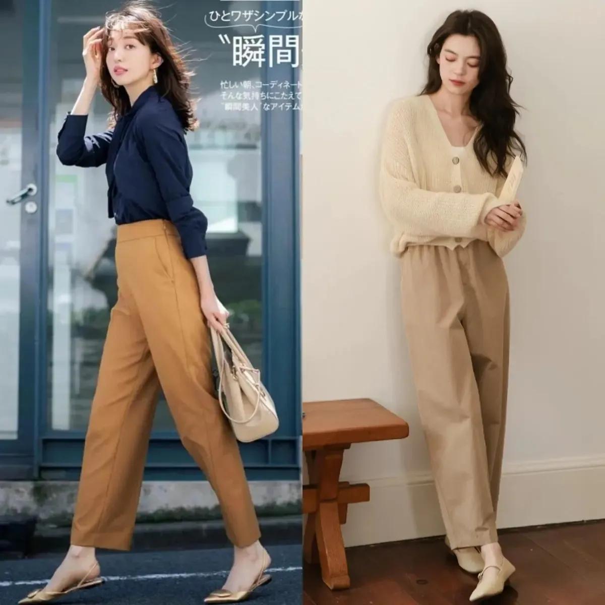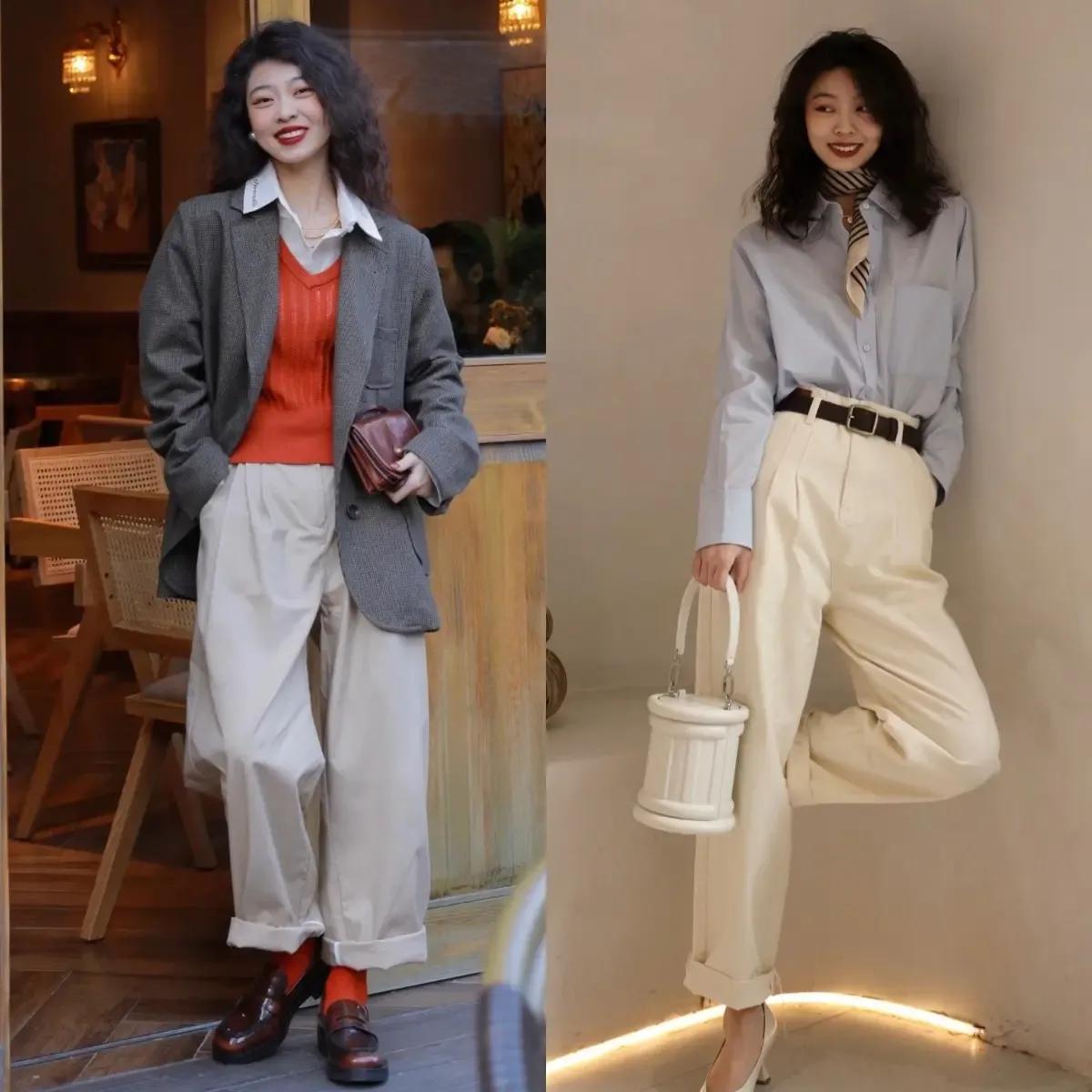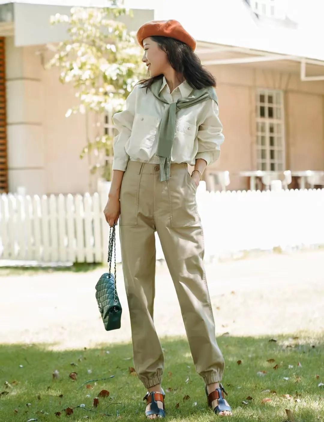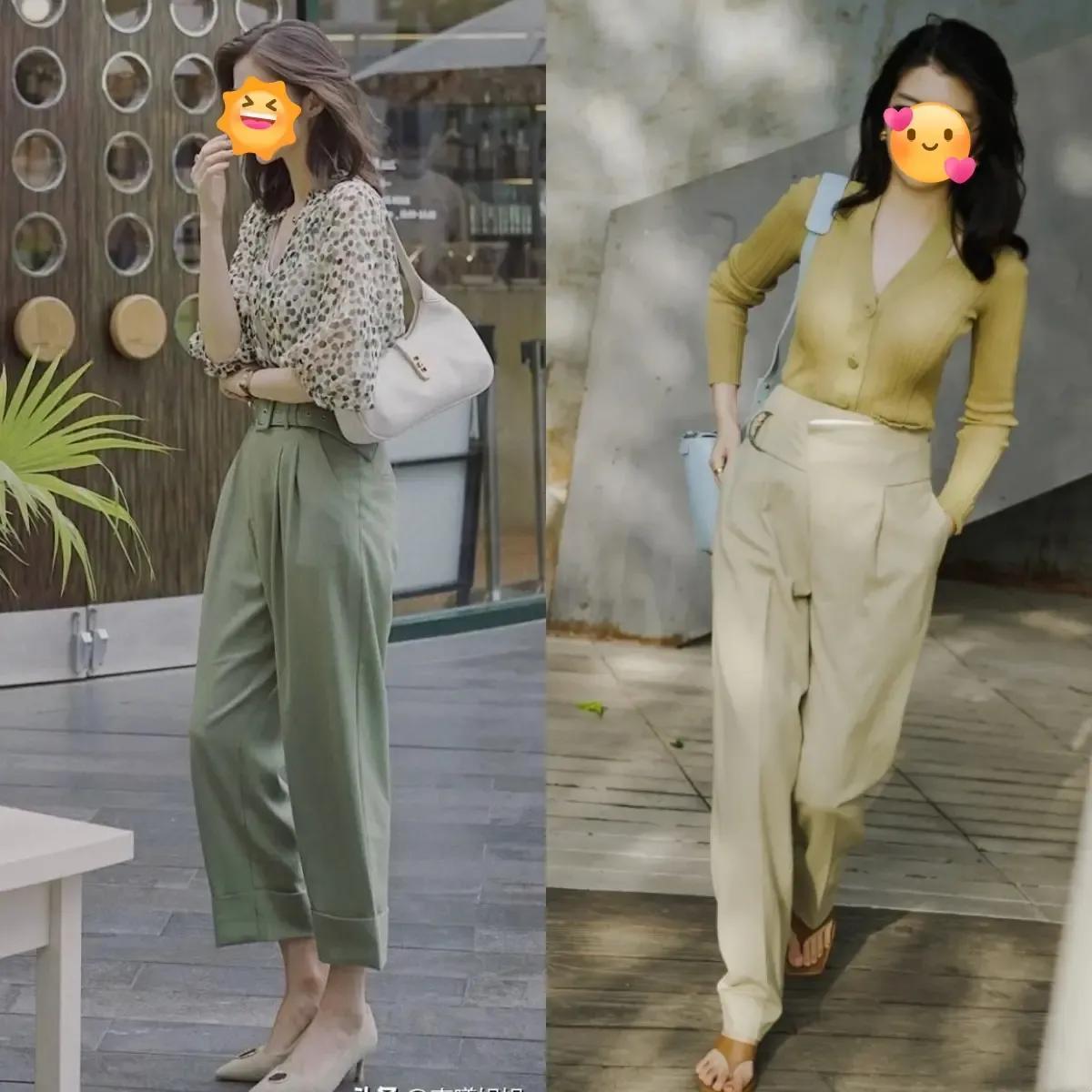 不管如何搭配整体的穿衣打扮,不要过于花哨,简约的色调,经典色调搭配起来更好看。例如下面这种棕色或者是卡其色的西装裤,就是非常经典的颜色,咱们可以搭配藏蓝色的衬衫,显得比较成熟干练,换成浅黄色的针织开衫,展现出来的效果,温柔大气又耐看,还修饰肤色,显白显嫩。