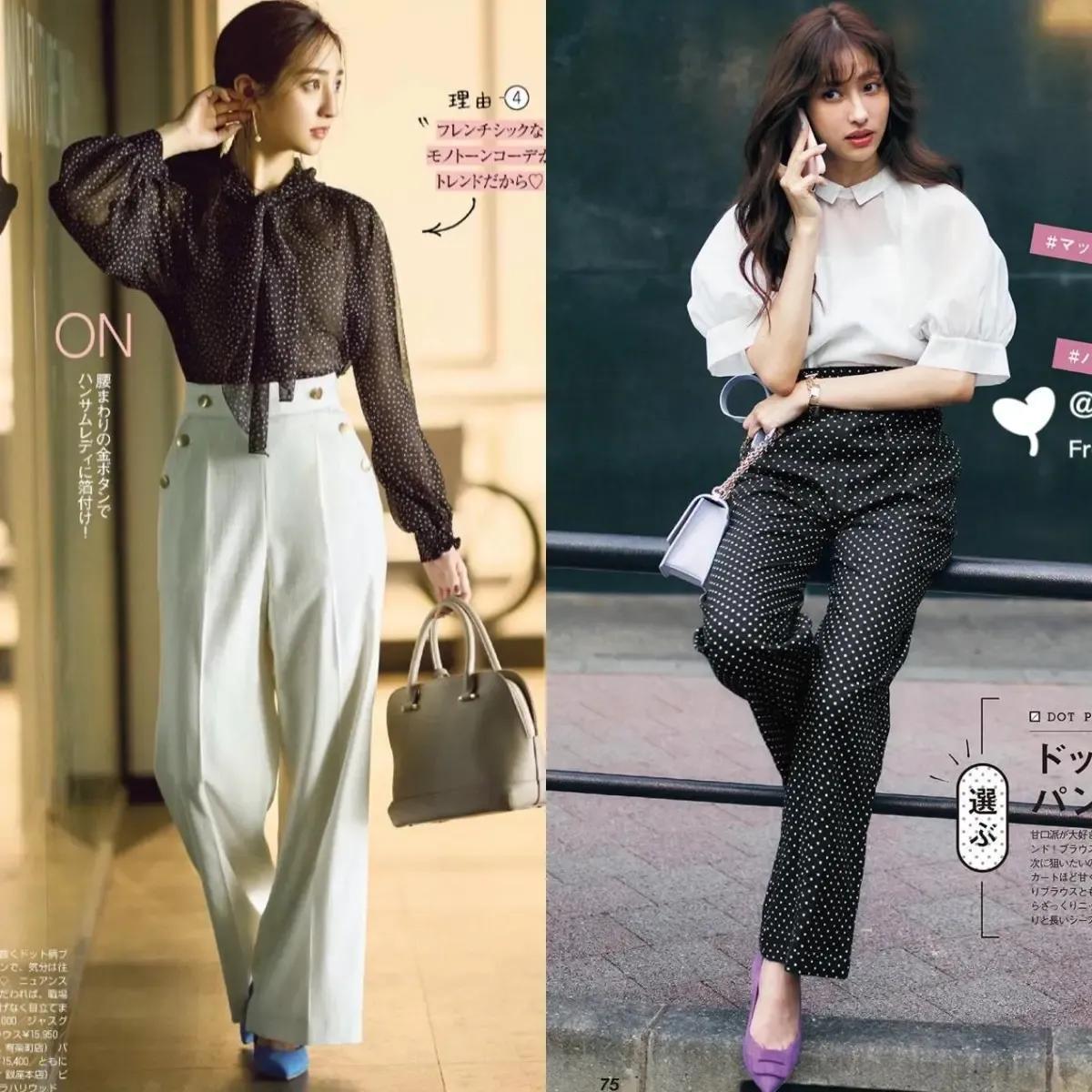 想让自己的穿搭比较小众又时髦的情况下,咱们可以在衣服的款式上下点功夫,例如,下面用一件黑白波点的雪纺衬衫上衣,搭配上白色的西装阔腿九分裤,脚上穿了一双雾霾蓝的浅口高跟单鞋,这样的穿搭不光温柔,而且还很时尚。
