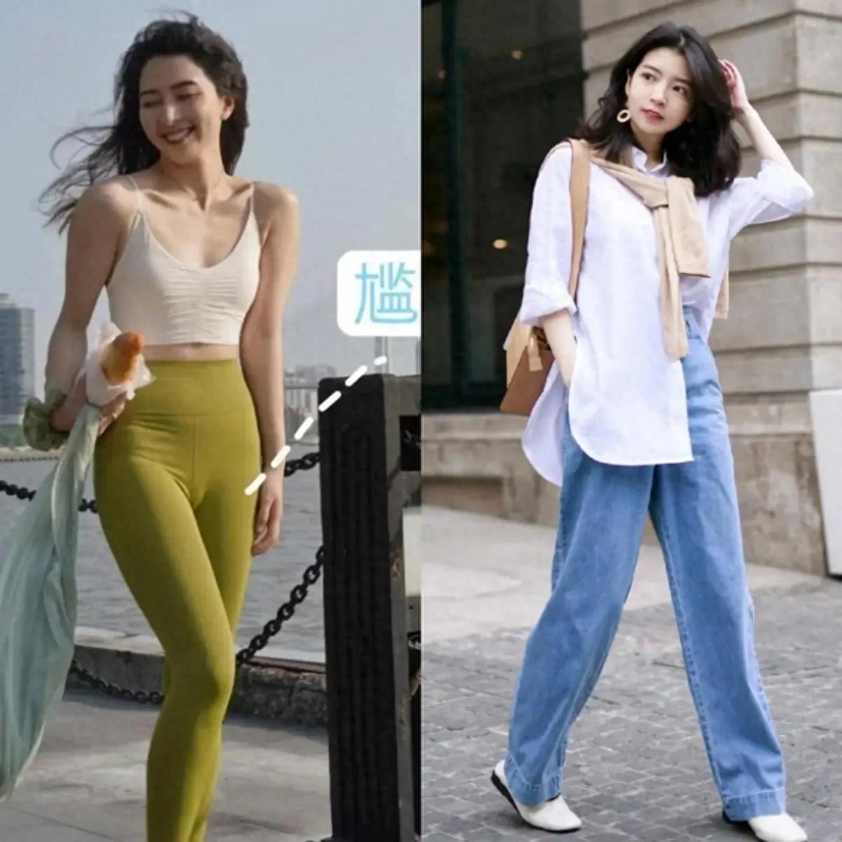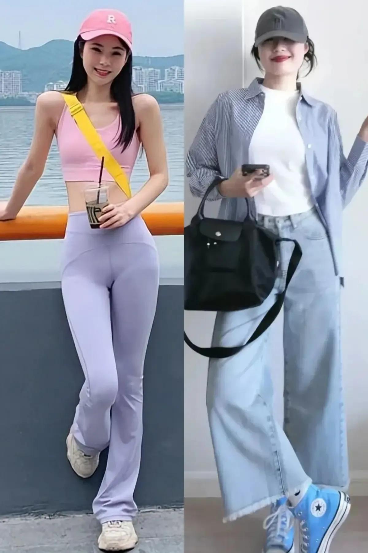 咱们就看下面这2套穿衣对比就可以得出一个非常明确的答案,选择粉色的运动背心,搭配上浅紫色的无痕裤,脚上穿了一双运动鞋,穿出来并没有多洋气。