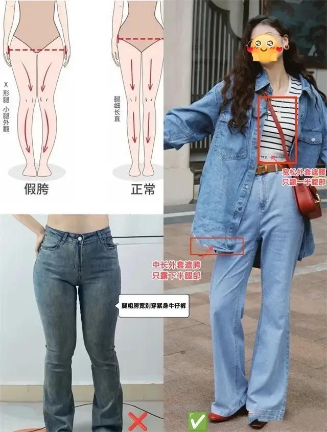除了无痕裤,尽量不要穿之外,还有紧身裤,例如下面这一条牛仔紧身裤,穿在身上之后就很容易把假胯宽大腿粗等这些问题暴露出来。